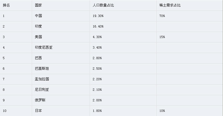 表:2014年世界人口排名前10位的国家及其稀土需求占比统计